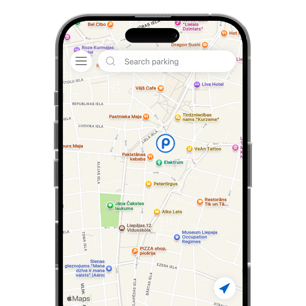 Lietotnē viegli atradīsi tuvāko un izdevīgāko stāvvietu.